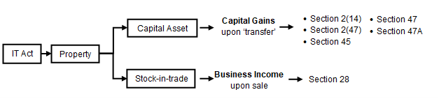 Section 45 deals with the taxation of ‘Capital Gains’. It provides that profits or gains from transferring a capital asset during the previous year are chargeable to income-tax under the head “Capital gains”. Section 2(14) of the IT Act defines ‘capital asset’ to mean property of any kind held by a person. Shares in a company are treated as “property” and hence as a “capital asset”. However, ‘capital asset’ does not include “stock-in-trade” held for the purposes of business or profession.