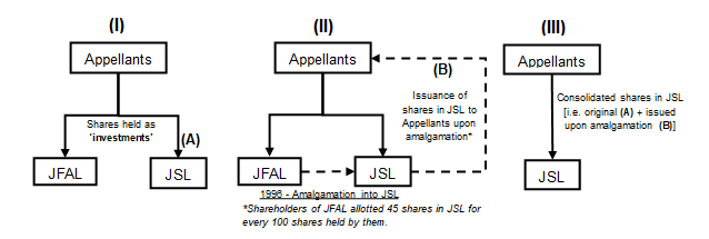 Under the provisions of Income-tax Act, 1961 (“IT Act”), any ‘transfer’ (as defined in Section 2(47) of IT Act1) of capital asset would trigger capital gains tax incidence in hands of seller of such capital asset in the year of ‘transfer’ thereof. Shares are also treated as capital asset. However, there are certain transactions which are not regarded as ‘transfer’ and Section 47 deals with ‘Transactions not regarded as transfer’. Section 47(vii) provides that any transfer by shareholder in a scheme of amalgamation of capital asset being shares held in amalgamating company, shall not be regarded as ‘transfer’ if such transfer is made in consideration of allotment of shares in amalgamated company being an Indian company. Accordingly, in respect of transfer of shares in JFAL in lieu of allotment of shares in JSL under the Scheme, Appellants claimed exemption under Section 47(vii) for Assessment Year 1997-98.