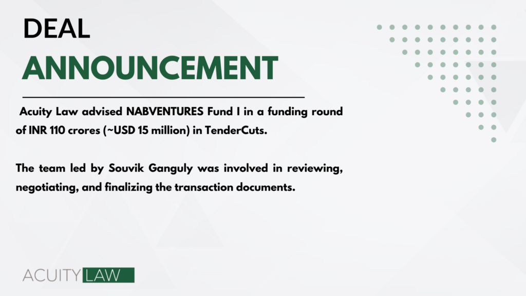 Acuity Law advised NABVENTURES Fund I in a funding round of INR 110 crores (~USD 15 million) in TenderCuts, which is a new age Tech enabled company providing freshly cut meat and seafood to customers through our neighborhood stores, which caters not only to retail as well as new age online consumer. The team led […]