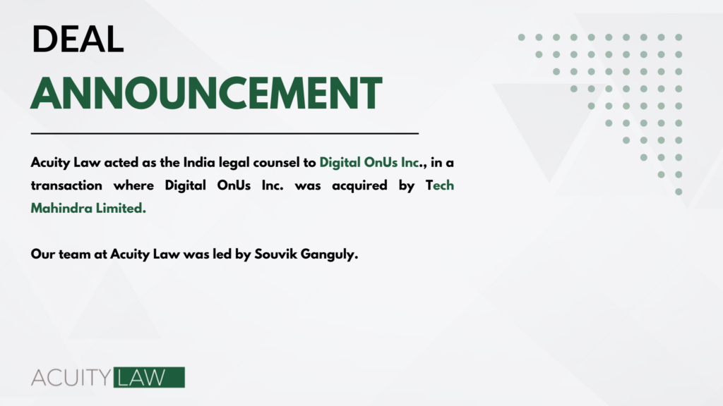 Acuity Law acted as the India legal counsel to Digital OnUs Inc., in a transaction where Digital OnUs Inc. was acquired by Tech Mahindra Limited. Digital OnUS Inc. is a hybrid-cloud digital entity, which provides end-to-end transformation and new age capabilities including enterprise DevOps and cloud native development technologies. The total deal value for the […]