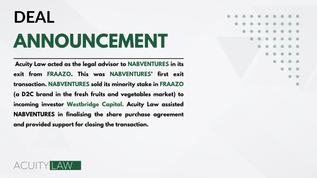 We are pleased to announce that Acuity Law acted as the legal advisor to NABVENTURES in its exit from FRAAZO. This was NABVENTURES’ first exit transaction. NABVENTURES sold its minority stake in FRAAZO (a D2C brand in the fresh fruits and vegetables market) to incoming investor Westbridge Capital. Acuity Law assisted NABVENTURES in finalising the […]