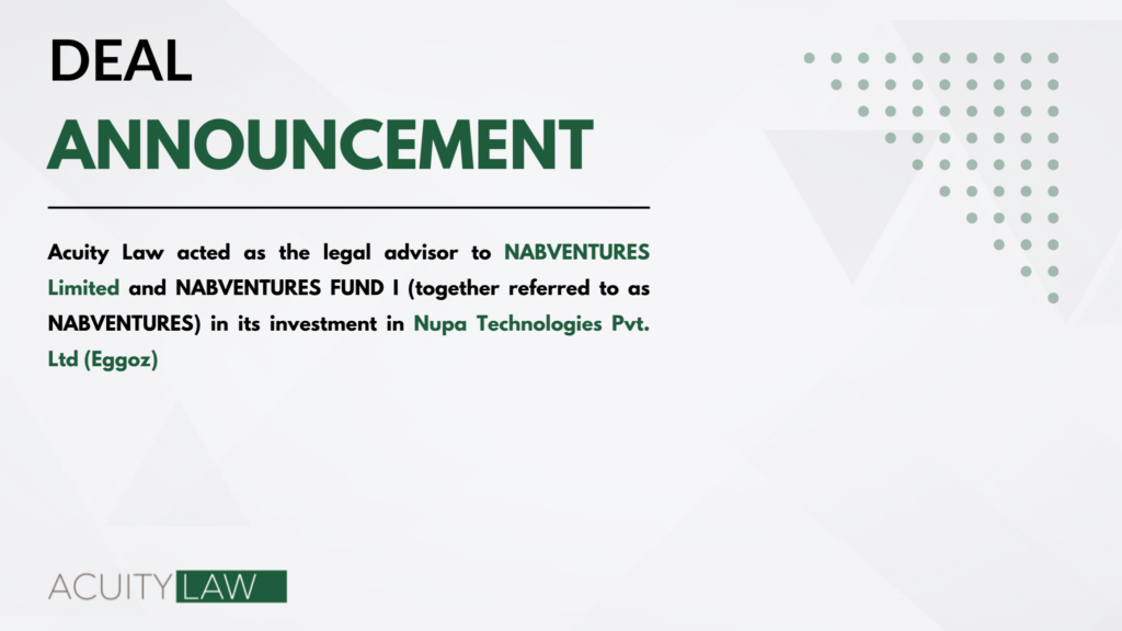 We are pleased to announce that Acuity Law acted as the legal advisor to NABVENTURES Limited and NABVENTURES FUND I (together referred to as NABVENTURES) in its investment in Nupa Technologies Pvt. Ltd (Eggoz). NABVENTURES Fund I is managed by NABVENTURES Limited, a wholly owned subsidiary of the National Bank for Agriculture and Rural Development […]