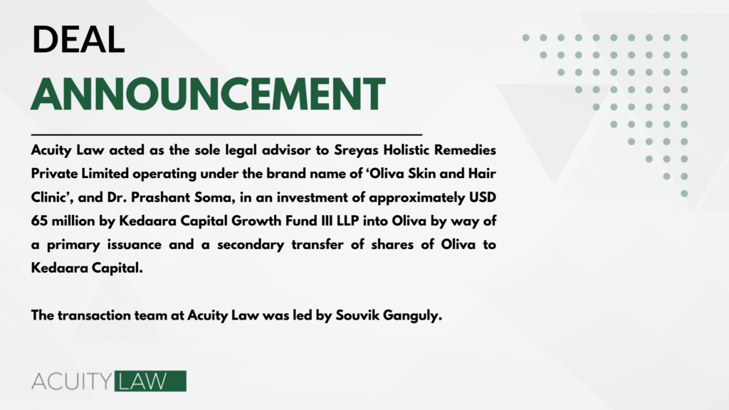 We are pleased to announce that Acuity Law acted as the sole legal advisor to Sreyas Holistic Remedies Private Limited operating under the brand name of ‘Oliva Skin and Hair Clinic’ (“Oliva”), and Dr. Prashant Soma, promoter and shareholder of Oliva, in an investment of approximately USD 65 million by Kedaara Capital Growth Fund III […]