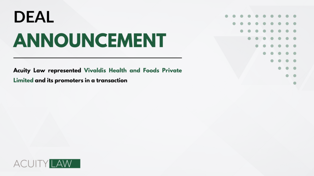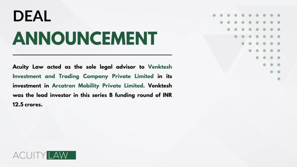 We are pleased to announce that Acuity Law acted as the sole legal advisor to Venktesh Investment and Trading Company Private Limited (“Venktesh”) in its investment in Arcatron Mobility Private Limited (“Company”). Venktesh was the lead investor in this series B funding round of INR 12.5 crores. To read more about the transaction please click […]