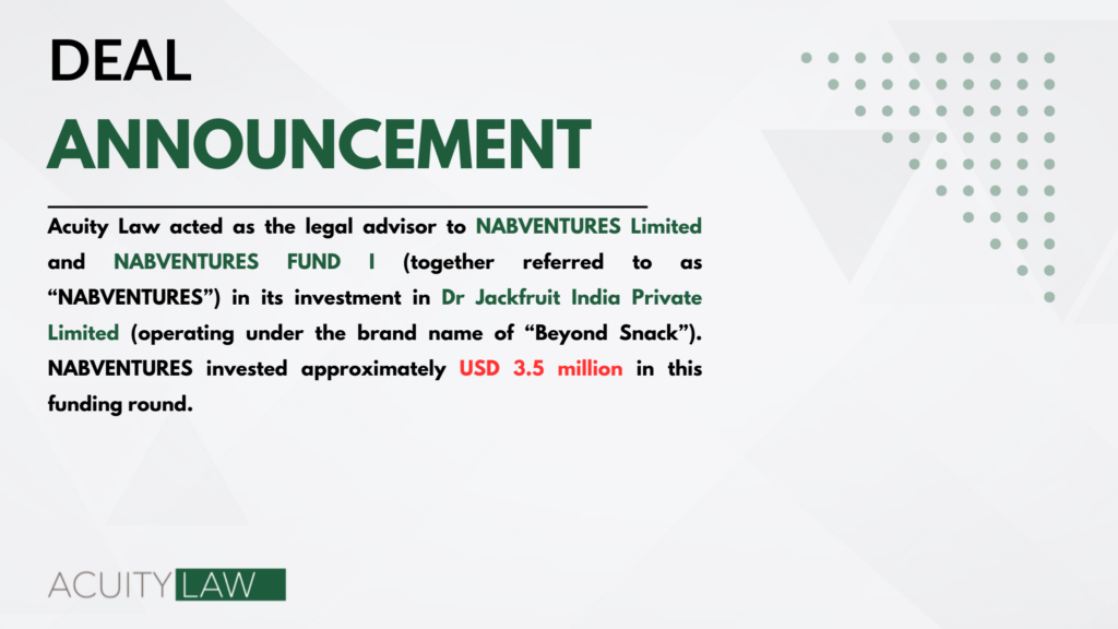 We are pleased to announce that Acuity Law acted as the legal advisor to NABVENTURES Limited and NABVENTURES FUND I (together referred to as “NABVENTURES”) in its investment in Dr Jackfruit India Private Limited (operating under the brand name of “Beyond Snack”). NABVENTURES invested approximately USD 3.5 million in this funding round. To read more […]