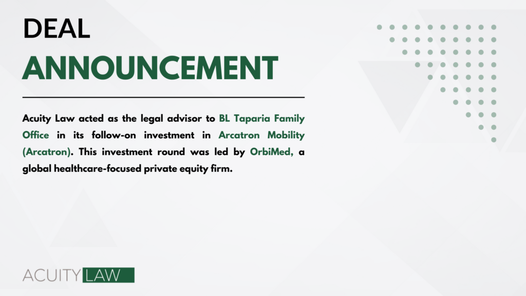 We are pleased to announce that Acuity Law acted as the legal advisor to BL Taparia Family Office in its follow-on investment in Arcatron Mobility (Arcatron). This investment round was led by OrbiMed, a global healthcare-focused private equity firm. To read more about the transaction please click here.  Arcatron under the brand “Frido” designs mobility products, […]